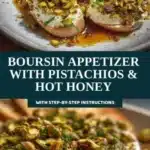 What makes the Boursin Appetizer with Pistachios & Hot Honey truly special is its harmonious combination of flavors and textures. The Boursin cheese serves as a beautiful, creamy base that offers rich, buttery notes followed by a burst of garlic and herb seasoning. The pistachios add a delightful crunch, bringing an earthy quality that complements the creaminess of the cheese.