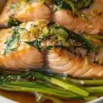 As I sliced the ginger, its sharp, spicy scent enveloped me and transported me back to my grandmother’s kitchen in Asheville. She always believed that ginger brought good fortune and vibrant energy into meals, and I’ve carried that tradition with me. The vibrant pink of the salmon fillet contrasted beautifully with the golden hue of the ginger, and I could hardly wait to watch it steam to perfection. With just the right balance of soy and subtle herbs, this dish soon became a family favorite, cherished for its simplicity and depth of flavor. It felt like a warm hug on a plate, reminding me that the best meals are often the easiest to create, shared over laughter and stories.