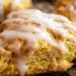 Freshly baked pumpkin scones drizzled with maple glaze on a plate